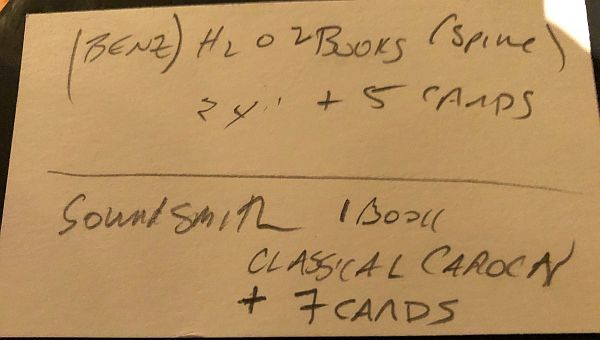 While in Dallas, I realized that I didn’t have my spacer set with me (multiple thicknesses of acrylic), so I had to make due with two paperback Chess books and a dozen or so business cards. The quick and dirty notes in the photo allowed us to swap back and forth repeatedly between a Benz H2O and a Soundsmith Zephyr cartridge (removable headshell on the Abis arm) – obviously resetting the tracking force as well.