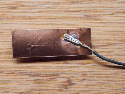 - Cut a strip to a size you’ve determined to work and solder a ground wire to it as shown in the photo.
