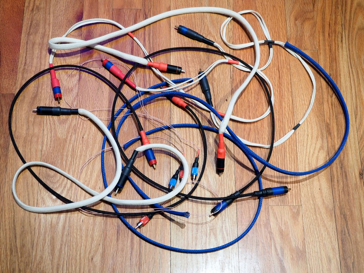 All of these builds employ the same litz wire in the same geometry. The difference lies in the sleeves and RCA connectors. In addition to the four “contenders”, I pulled out an early prototype to serve as a historical baseline. In order – from best to worst: