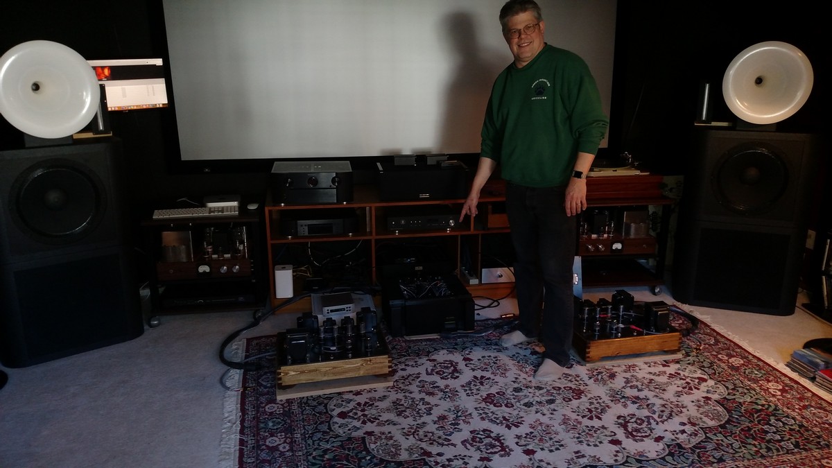 In the photo above, Gary is pointing to a unique power amp designed by another Northwesterner – Gary Pimm: a transformer coupled solid state amplifier. On the shelves are the push-pull 300B Amity amplifiers, and in the foreground are the NiWatts.